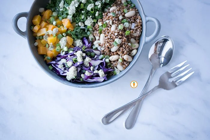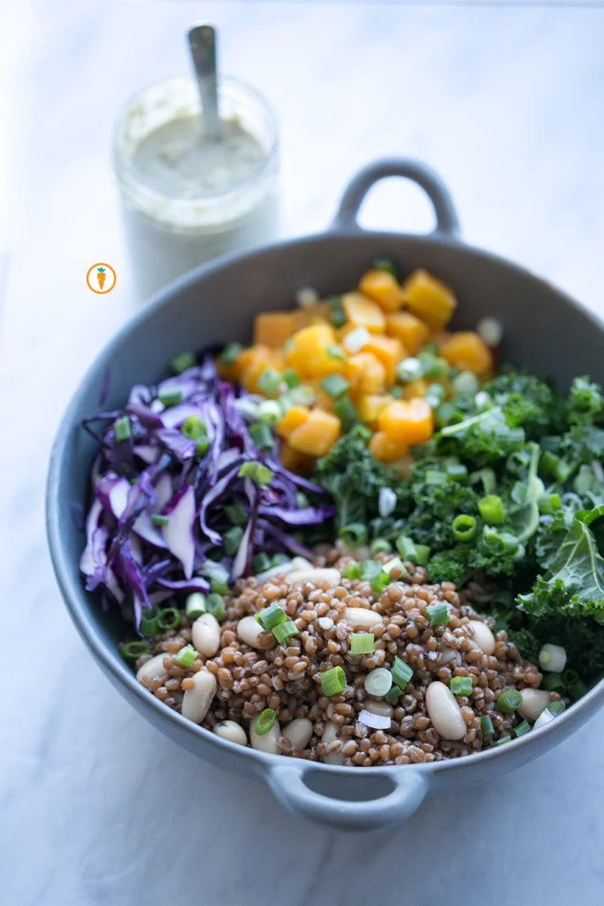 Once your wheat berries and squash are ready, assemble the remaining salad ingredients into a salad bowl (shredded cabbage, white kidney beans, kale and green onion). Add as much or as little of each ingredient as you wish (yup, you decide what and how much you want).